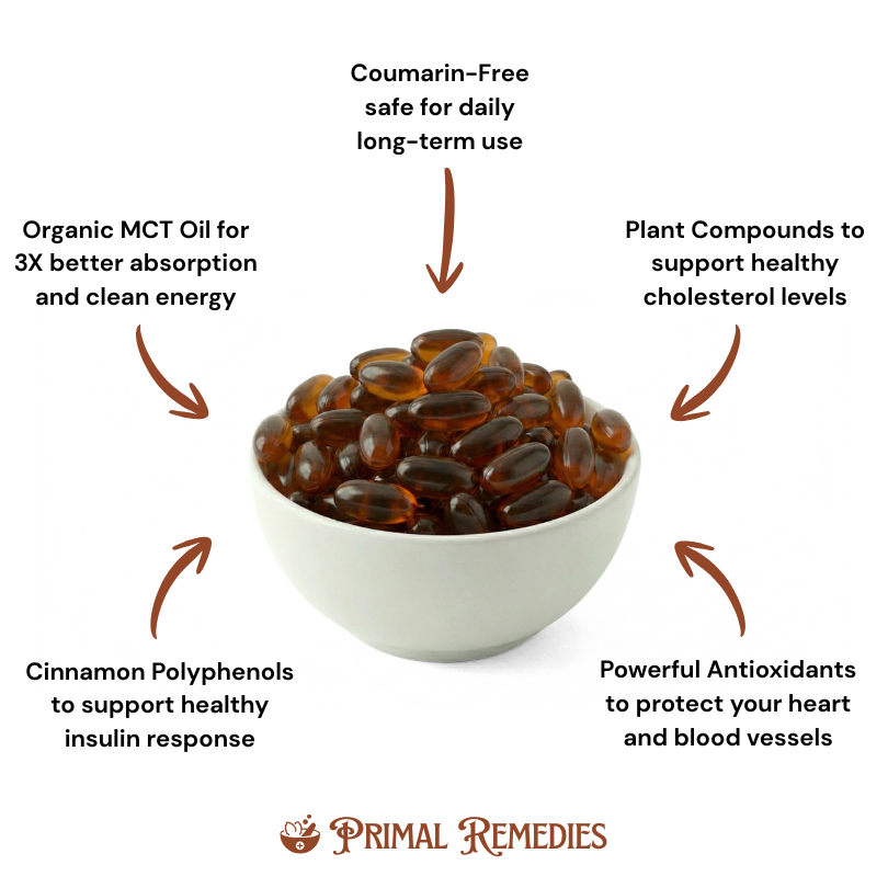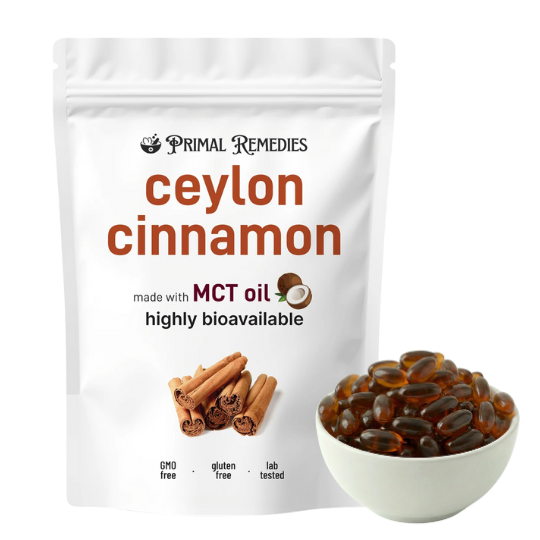 Primal Remedies Ceylon Cinnamon 7200mg delivers therapeutic-strength cinnamon polyphenols enhanced with MCT oil — helping your body: